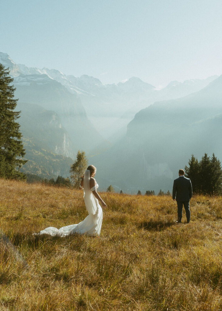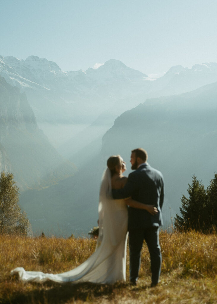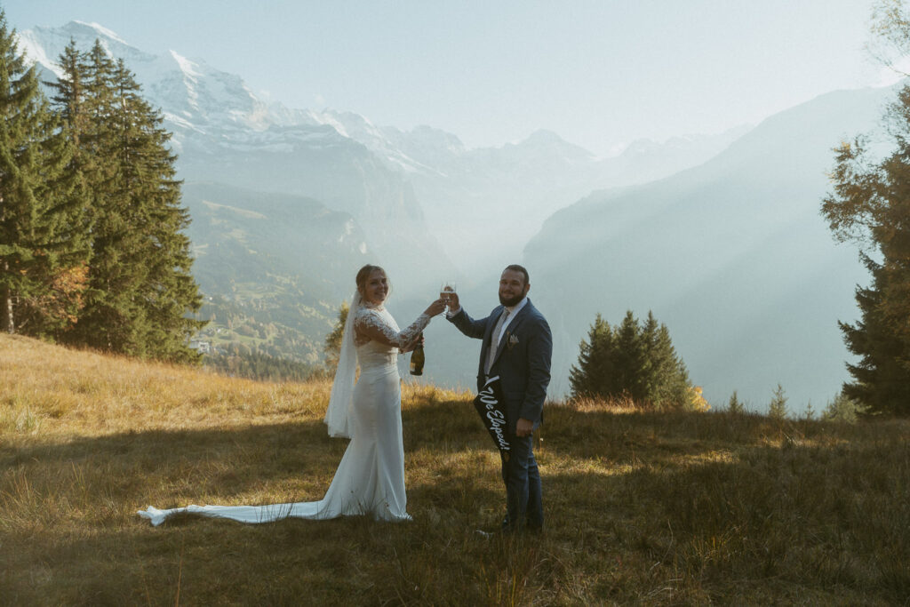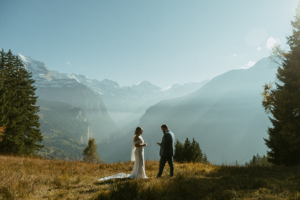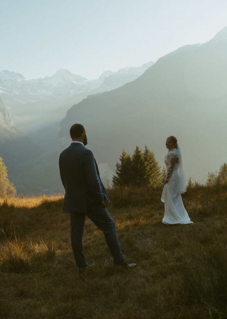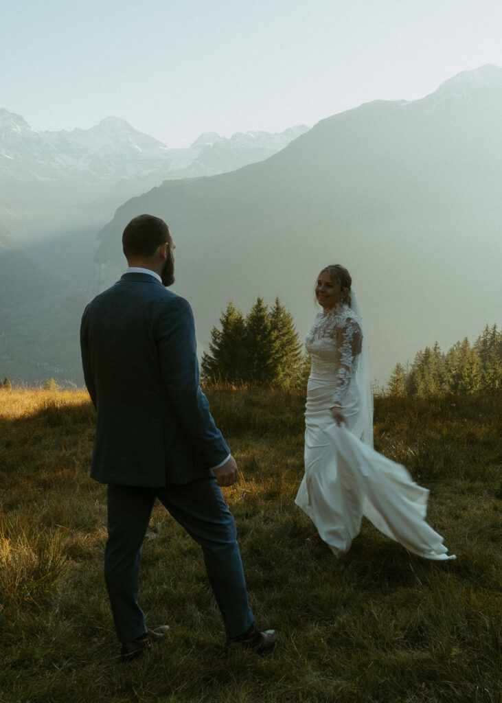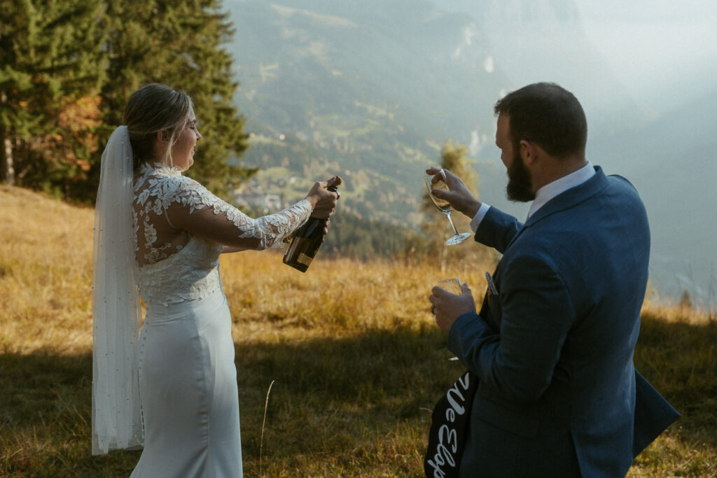 They started the day with a cozy getting ready at their hotel in Wengen. The view from their room was already breathtaking. I had time to get some detail shots and they got ready for their day. Once they were dressed and ready, we laced up our boots and started the hike toward an overlook above the entire Lauterbrunnen Valley. When we reached the spot, it genuinely took our breath away. The whole valley stretched out beneath us—steep peaks, tiny chalets, and the dramatic drops that make this region feel like a dream. It was here that they chose to do their first look. They wanted to do an official first look in the beginning. So I gave them their space and took some pictures from further away. After this, they said their vows, which was a very emotional and beautiful moment. It was just us up on this mountain with the most amazing view and it felt magical. They popped a bottle of champagne afterward—because what’s an elopement without a little celebration? Their joy was contagious. From there, we spent the evening wandering around, capturing the two of them in that warm, late-summer light.
