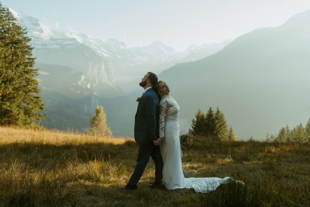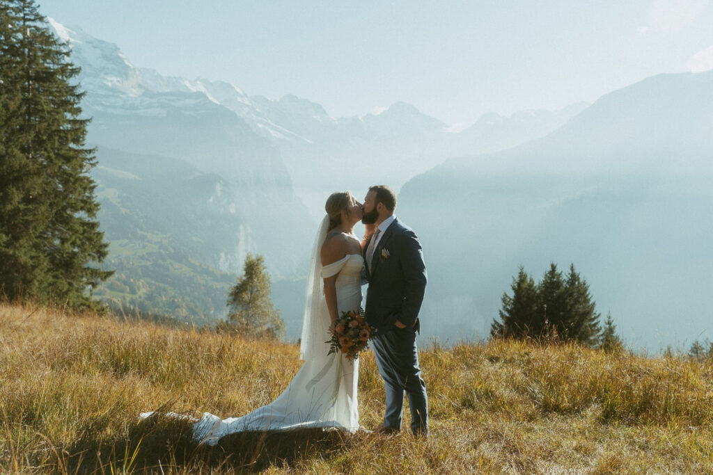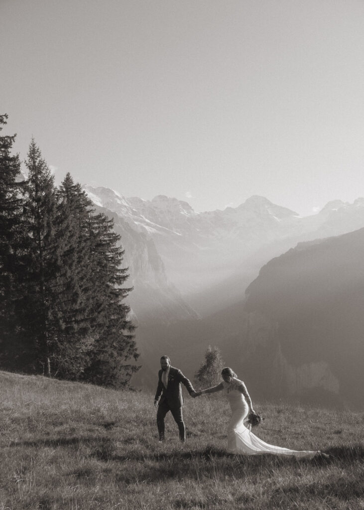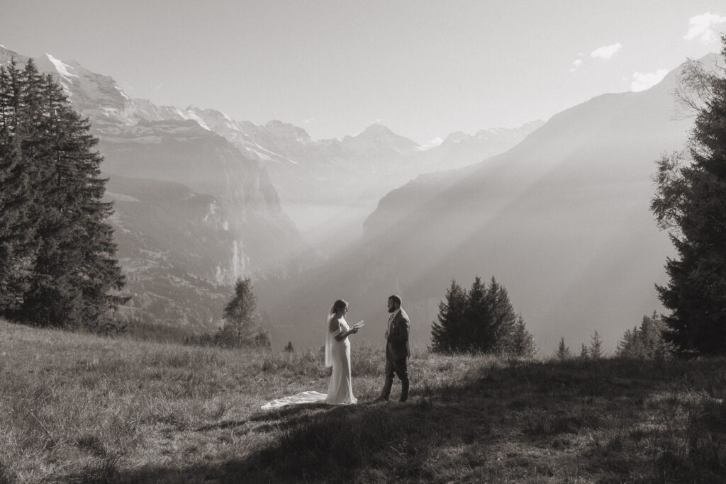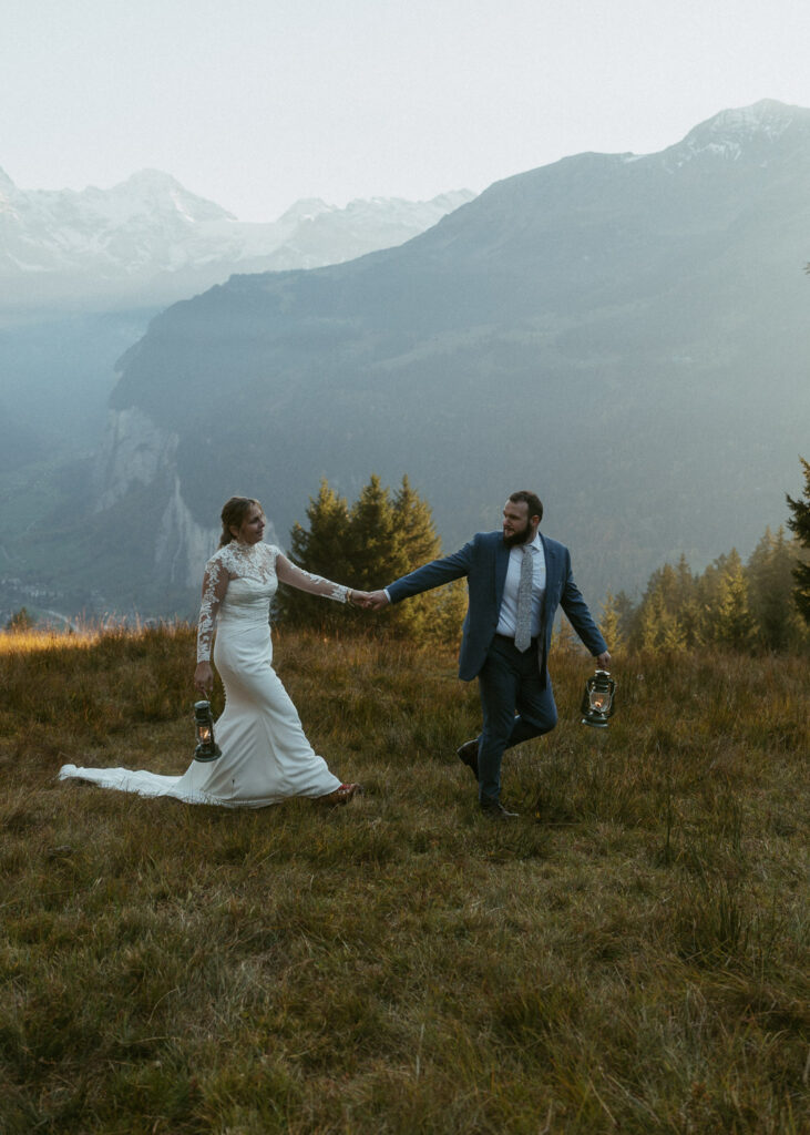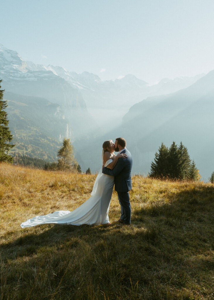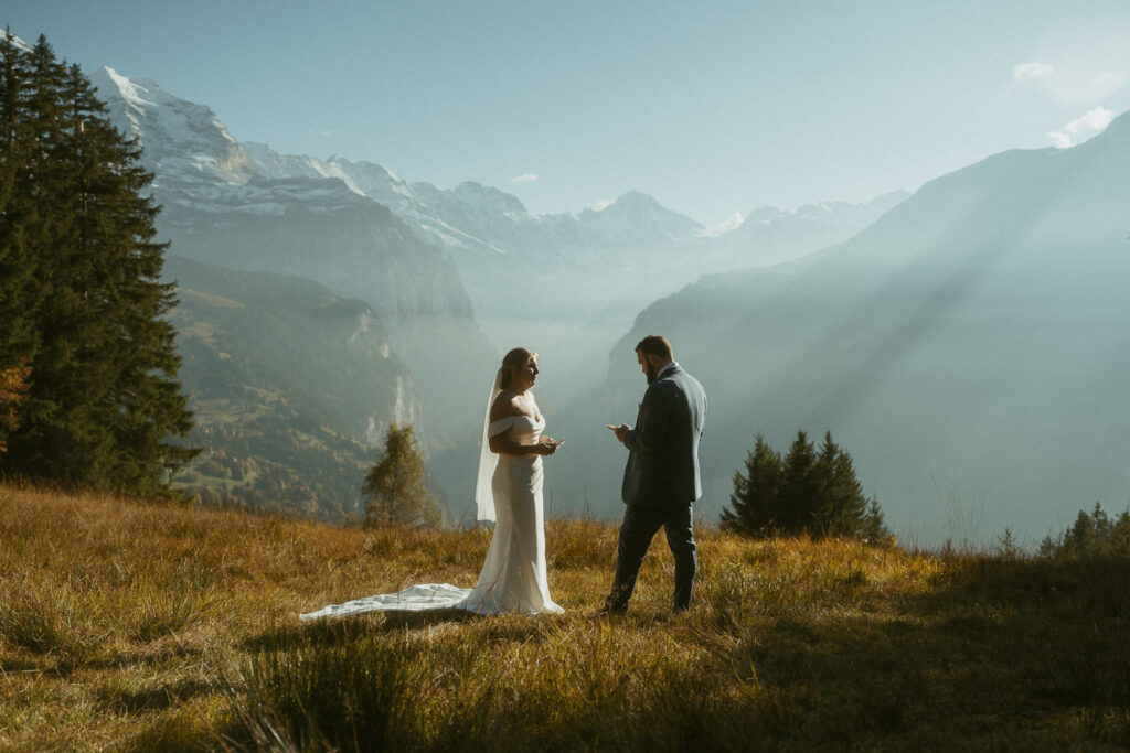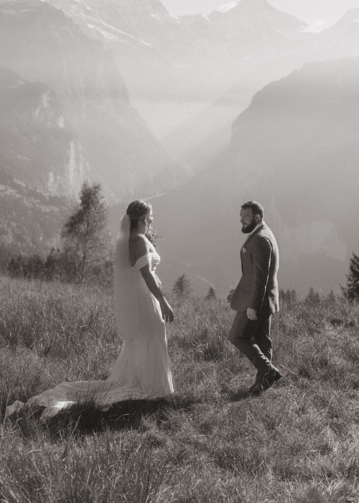 They started the day with a cozy getting ready at their hotel in Wengen. The view from their room was already breathtaking. I had time to get some detail shots and they got ready for their day. Once they were dressed and ready, we laced up our boots and started the hike toward an overlook above the entire Lauterbrunnen Valley. When we reached the spot, it genuinely took our breath away. The whole valley stretched out beneath us—steep peaks, tiny chalets, and the dramatic drops that make this region feel like a dream. It was here that they chose to do their first look. They wanted to do an official first look in the beginning. So I gave them their space and took some pictures from further away. After this, they said their vows, which was a very emotional and beautiful moment. It was just us up on this mountain with the most amazing view and it felt magical. They popped a bottle of champagne afterward—because what’s an elopement without a little celebration? Their joy was contagious. From there, we spent the evening wandering around, capturing the two of them in that warm, late-summer light.