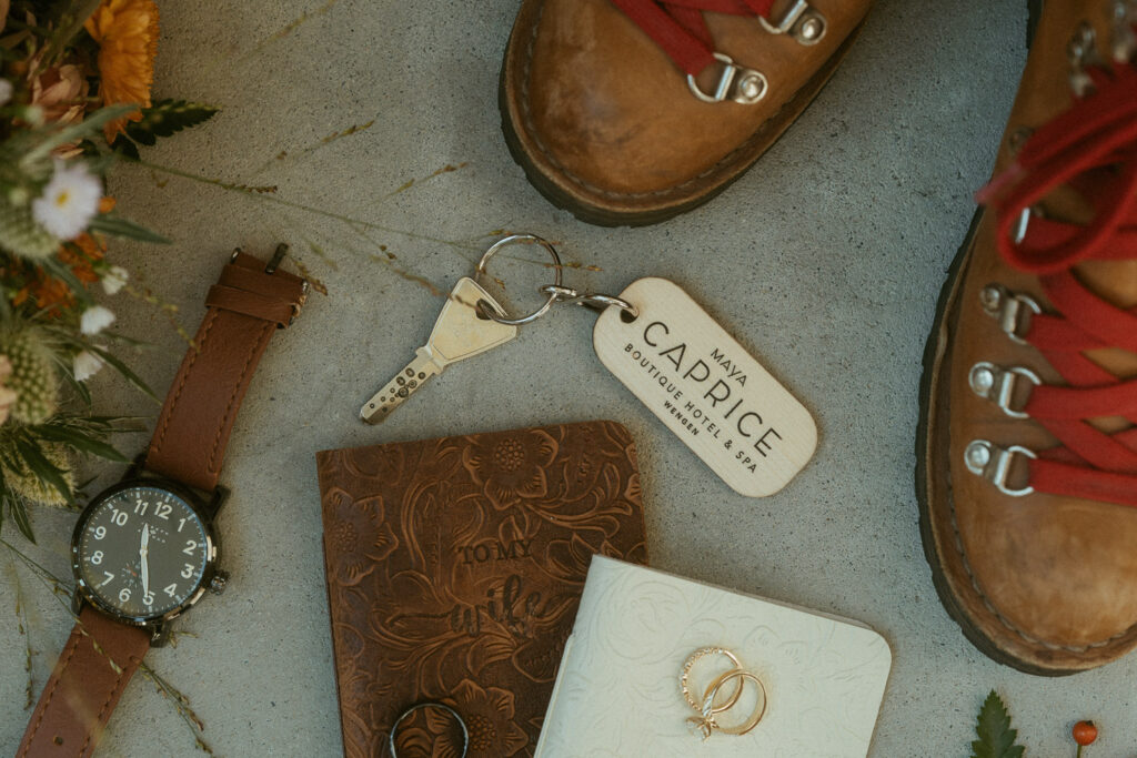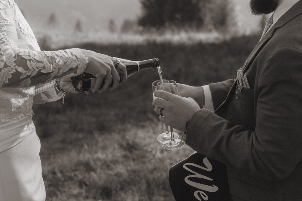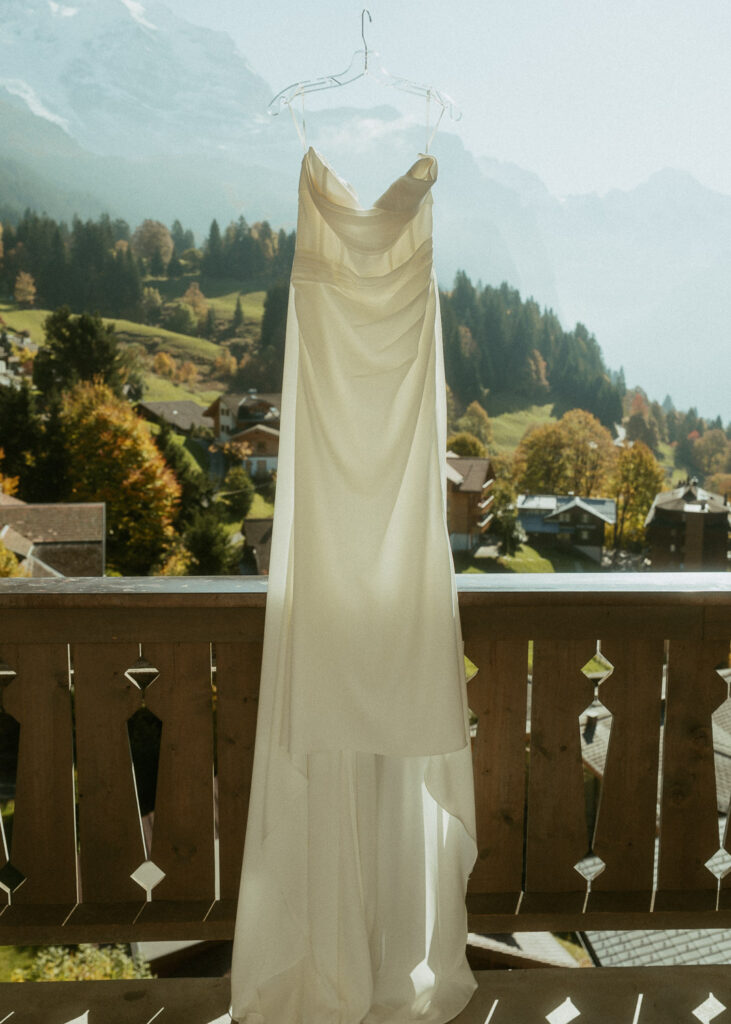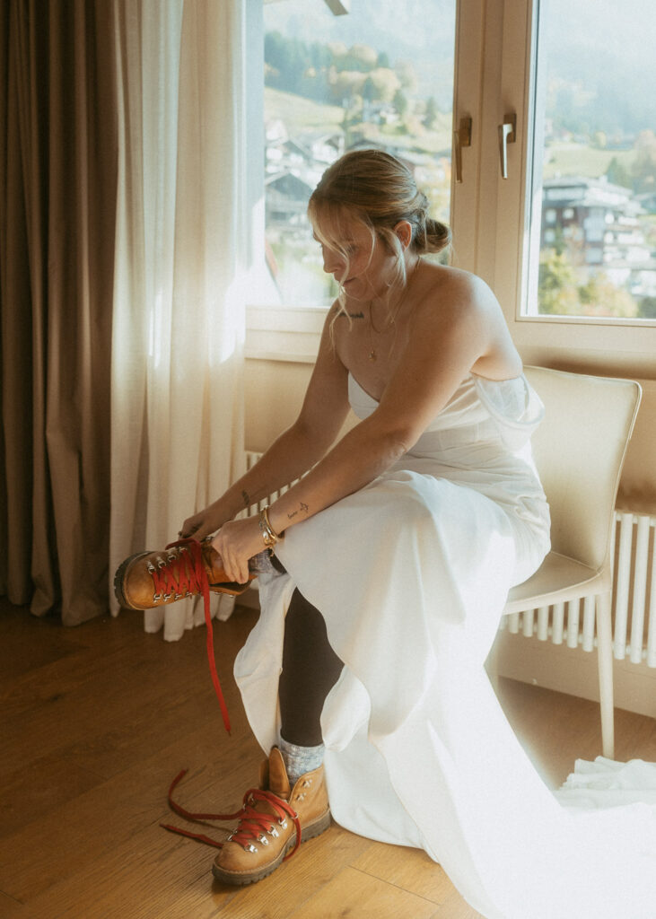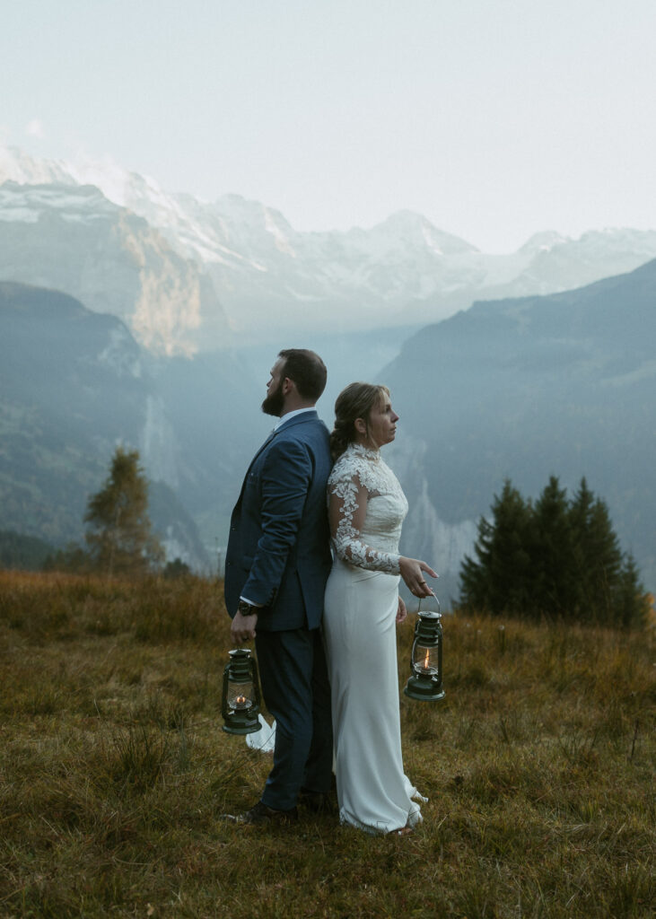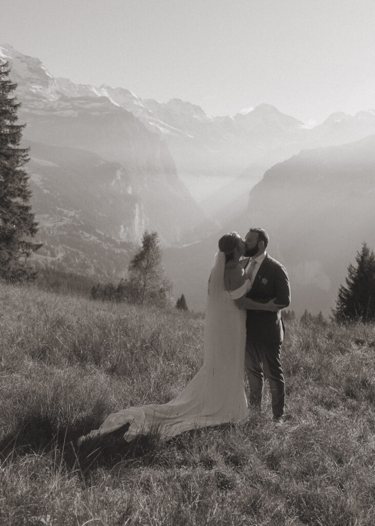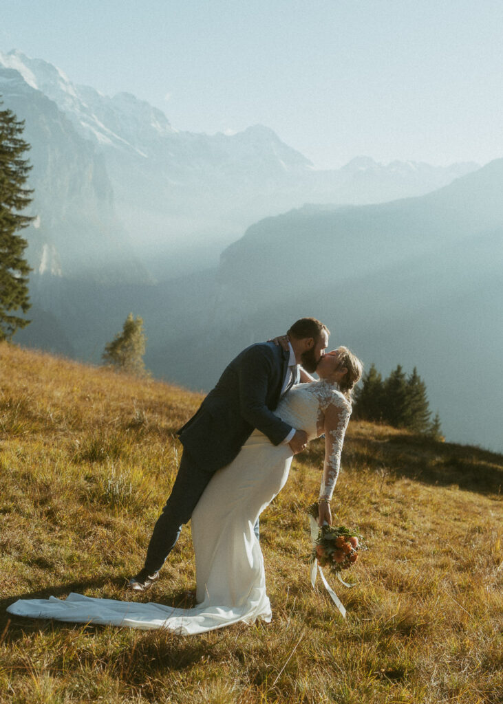 They started the day with a cozy getting ready at their hotel in Wengen. The view from their room was already breathtaking. I had time to get some detail shots and they got ready for their day. Once they were dressed and ready, we laced up our boots and started the hike toward an overlook above the entire Lauterbrunnen Valley. When we reached the spot, it genuinely took our breath away. The whole valley stretched out beneath us—steep peaks, tiny chalets, and the dramatic drops that make this region feel like a dream. It was here that they chose to do their first look. They wanted to do an official first look in the beginning. So I gave them their space and took some pictures from further away. After this, they said their vows, which was a very emotional and beautiful moment. It was just us up on this mountain with the most amazing view and it felt magical. They popped a bottle of champagne afterward—because what’s an elopement without a little celebration? Their joy was contagious. From there, we spent the evening wandering around, capturing the two of them in that warm, late-summer light.